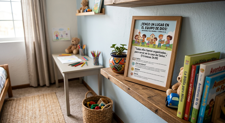 «Querido Dios, gracias porque me conoces por mi nombre. Ayúdame a ser ordenado y a cumplir con alegría las tareas que me das hoy. Quiero ser parte de tu equipo y servirte con todo mi corazón. Amén.»