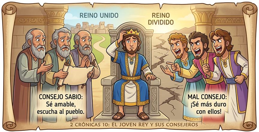 Pero luego, Roboam fue con sus amigos, los jóvenes que siempre jugaban con él. Ellos le dieron un consejo muy malo: «¡Diles que tú serás más duro que tu papá!». Lamentablemente, Roboam escuchó a sus amigos en lugar de a los sabios. ¿Sabes qué pasó? El pueblo se puso muy triste y el reino se dividió. Roboam aprendió por las malas que no todos los consejos son buenos.