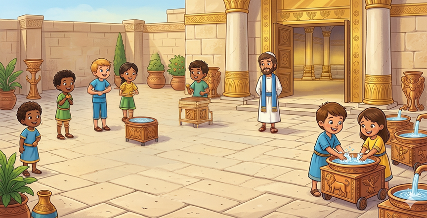 Corazones limpios: Así como los sacerdotes se lavaban en las fuentes, nosotros necesitamos que Jesús limpie nuestro corazón de la mentira o el enojo cada día.