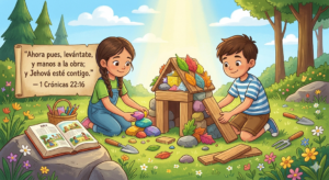 Hoy vas a ser un «constructor». Piensa en una acción buena que puedas hacer (ayudar en casa sin que te lo pidan, decir algo lindo a un amigo o compartir un juguete). Esa será tu «piedra preciosa» para construir algo lindo para Dios hoy.