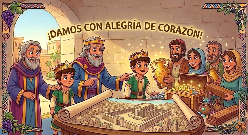 ¿Alguna vez has sentido una alegría tan grande que querías compartir todo lo que tenías? ¡Eso fue exactamente lo que pasó en Israel! El rey David puso el ejemplo y entregó sus tesoros personales para el Templo: oro, plata y piedras preciosas. Al ver su ejemplo, todos los líderes y el pueblo empezaron a dar también con muchísima alegría.