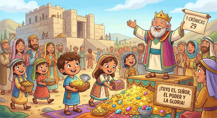 ¡Fue una fiesta de generosidad! La gente traía oro, plata y piedras preciosas con muchísima alegría. Pero David dijo algo muy importante en su oración: «Dios, nosotros no te estamos ‘regalando’ nada, solo te estamos devolviendo un poquito de todo lo que Tú nos diste primero».