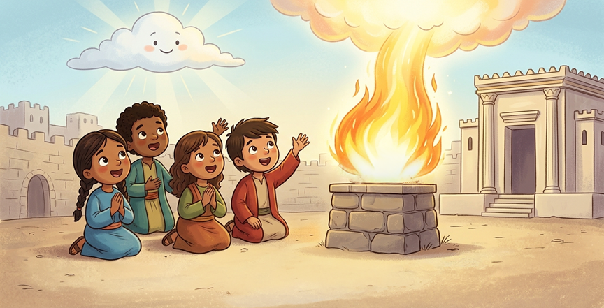 ¿Alguna vez has esperado con mucha emoción una respuesta? Cuando Salomón terminó de orar, ¡pasó algo asombroso! No cayó lluvia, ¡cayó fuego del cielo! Pero no era un fuego para asustar, sino para mostrar que Dios había escuchado y aceptado el regalo del pueblo.